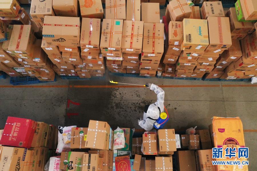 1月23日,菜鸟网络石家庄公共分拨中心工作人员在对快递包裹进行消杀作业(无人机照片)。