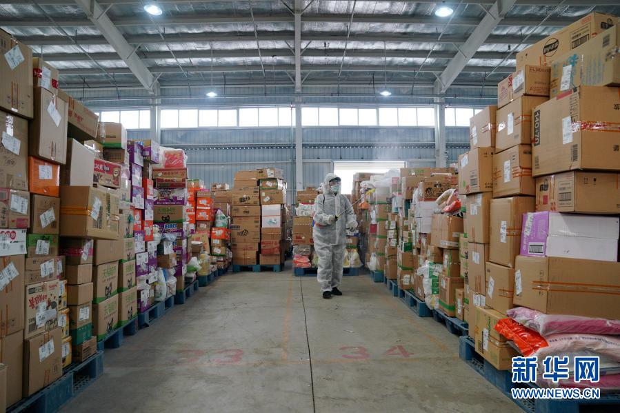 1月23日,菜鸟网络石家庄公共分拨中心工作人员在对快递包裹进行消杀。