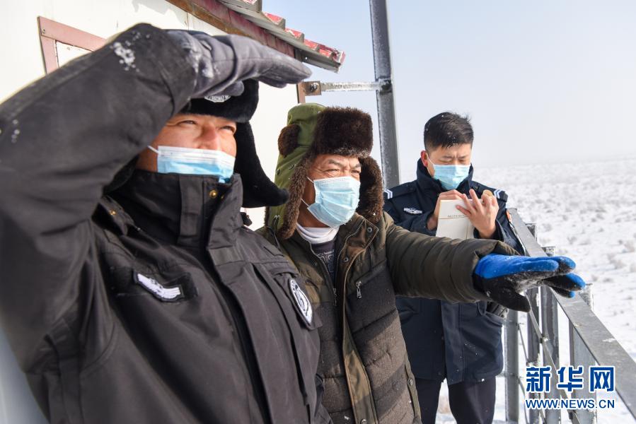 在吉木萨尔县国家公益林三叉路口管护站,巡查人员登上瞭望塔观察野生动物栖息地(1月22日摄)。