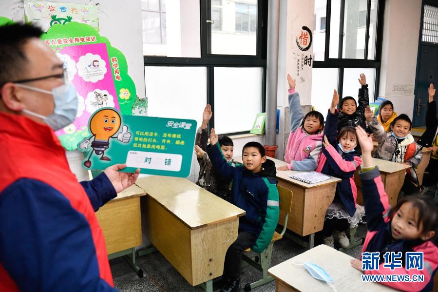 1月23日,在奉化区育才学校,志愿者(左一)与外来务工人员子女进行安全知识互动问答。