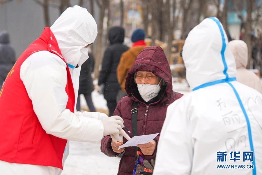 在吉林省通化市东昌区一核酸检测点,志愿者帮助一名接受核酸检测采样的居民填写身份信息(1月20日摄)。