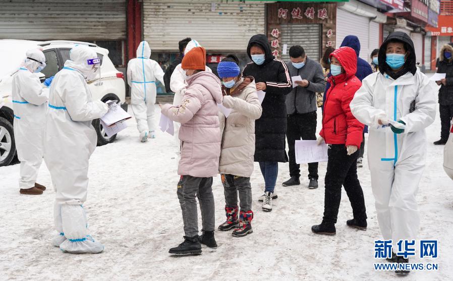 在吉林省通化市东昌区一核酸检测点,防疫人员核对接受第二轮核酸检测采样的居民身份信息(1月20日摄)。