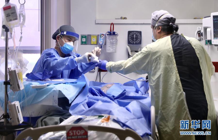1月22日,在美国加利福尼亚州蒙特贝洛市贝弗利医院,医护人员在“新冠病区”的重症监护室忙碌。