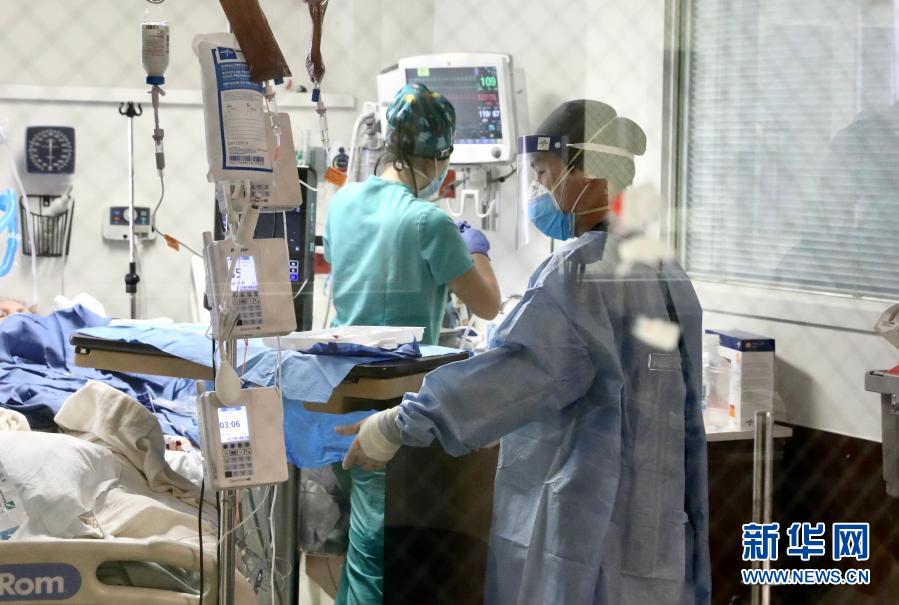 1月22日,在美国加利福尼亚州蒙特贝洛市贝弗利医院,医护人员在“新冠病区”的重症监护室忙碌。