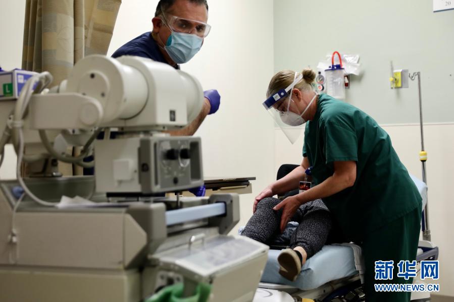 1月22日,在美国加利福尼亚州蒙特贝洛市贝弗利医院,医护人员在“新冠病区”治疗病人。