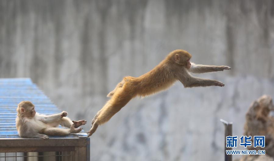 1月23日,在山东省滕州市动物园,猕猴在玩耍。