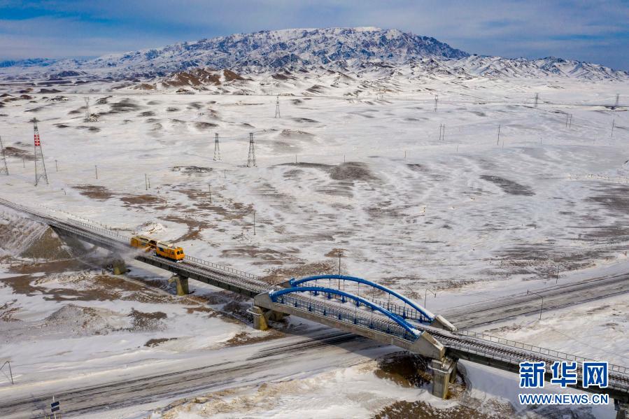 轨道除雪车在玛依塔斯风区克塔铁路沿线进行清雪作业(1月21日摄,无人机照片)。新华社记者 胡虎虎 摄