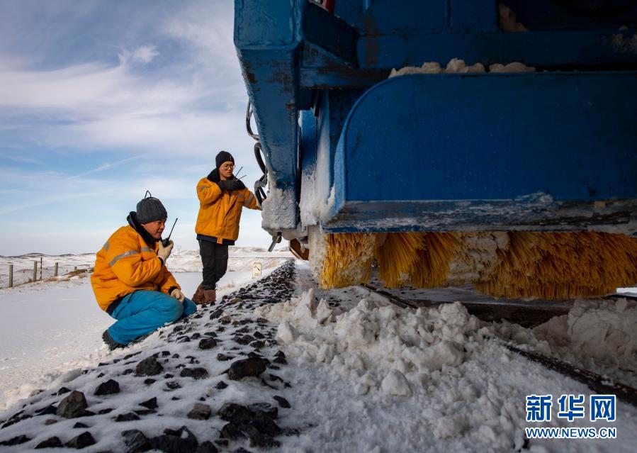 铁厂沟维修工队的工人杨生辉(右)和工友下车检查轨道除雪车上的清雪装置(1月21日摄)。新华社记者 胡虎虎 摄