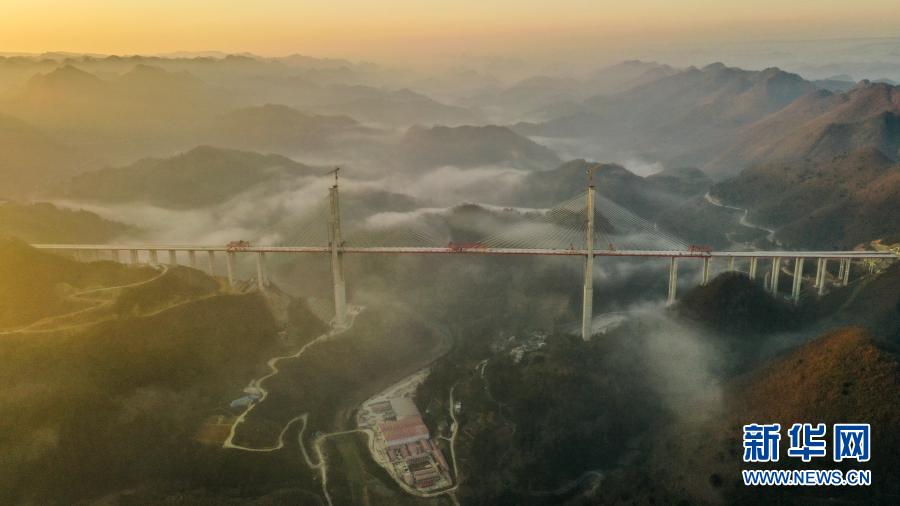 当日,由贵州桥梁集团承建的都(匀)安(顺)高速公路云雾大桥成功合龙。云雾大桥位于贵州省贵定县云雾镇境内,全长1720米,两座索塔设计为折“H”型钢筋混凝土结构,高度分别为273米和300米,是都安高速公路控制性工程。大桥成功合龙缩短了滇黔两省距离,对助推滇黔桂石漠化片区经济社会发展有重要意义。新华社记者 杨文斌 摄