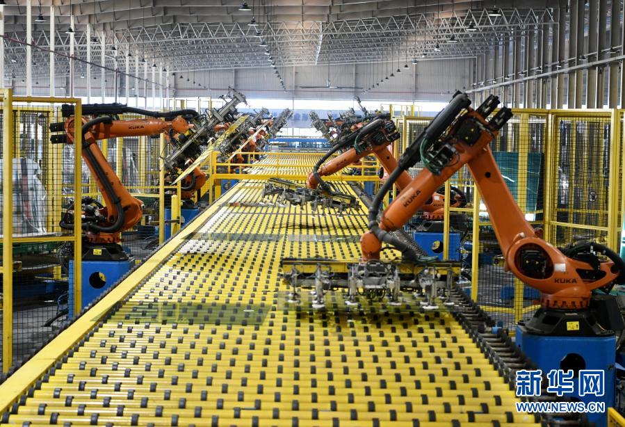 在福建省福清市的福耀玻璃集团汽车玻璃生产车间,机械手在生产线上作业(2021年1月12日摄)。