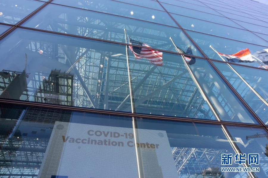 1月23日,美国纽约贾维茨会展中心内竖立着新冠疫苗接种中心的标牌。