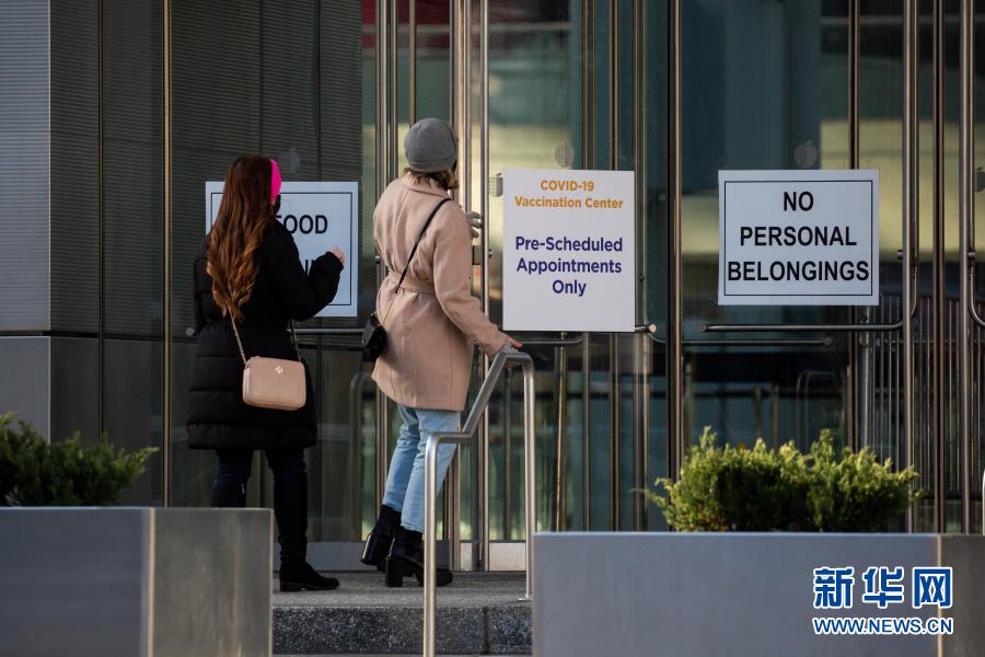 1月23日,在美国纽约,人们准备进入位于贾维茨会展中心的新冠疫苗接种中心。