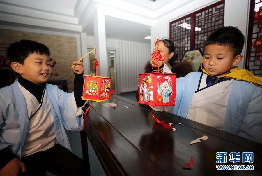 1月24日,在安徽省全椒县图书馆国学大讲堂上,小朋友展示刚刚制作的灯笼。新华社发(沈果 摄)
