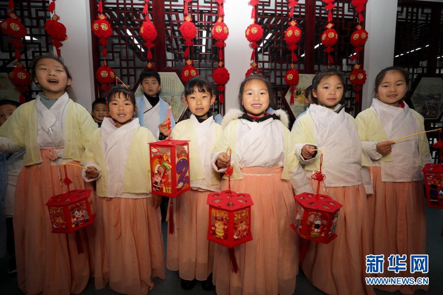 1月24日,在安徽省全椒县图书馆国学大讲堂上,孩子们展示刚刚制作的灯笼。新华社发(沈果 摄)