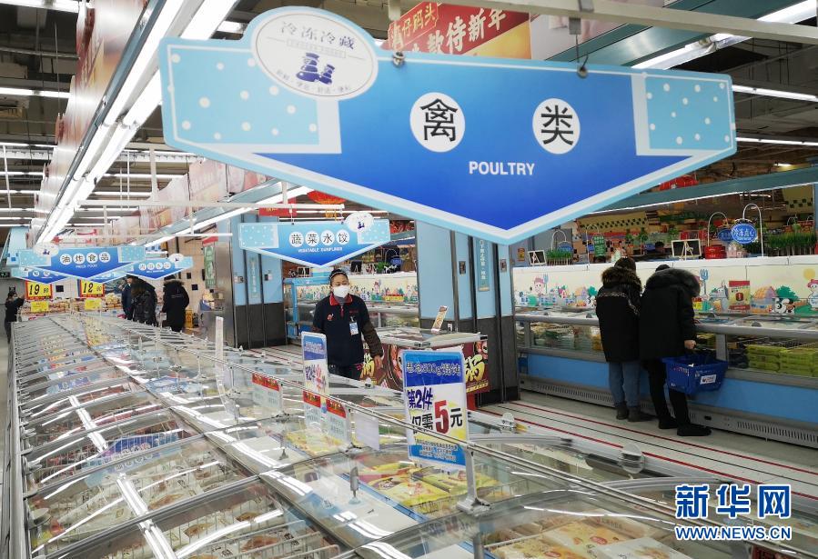 1月24日,在哈尔滨市香坊区一家大型超市,一名工作人员走向禽类冷冻冷藏冰柜区(手机照片)。新华社记者 王建威 摄