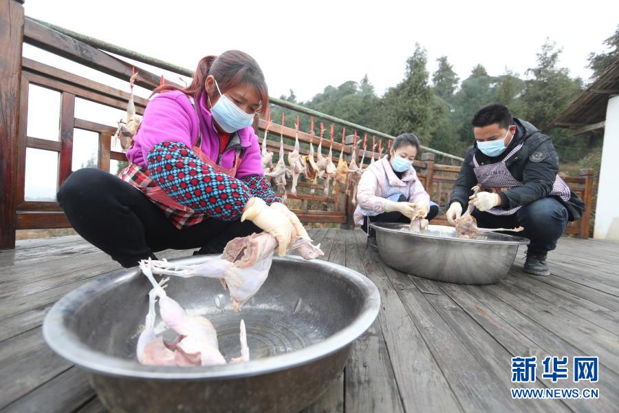 1月23日,在贵州省玉屏侗族自治县田坪镇彰寨村的一家山鸡腊制品作坊,工作人员加工腊山鸡。春节将至,作坊抓紧生产,供应年货市场。