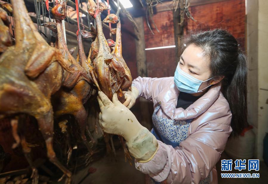 1月23日,在贵州省玉屏侗族自治县田坪镇彰寨村的一家山鸡腊制品作坊,工作人员查看腊山鸡熏制情况。春节将至,作坊抓紧生产,供应年货市场。