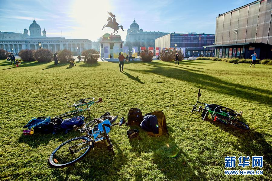 1月22日,在奥地利维也纳市英雄广场内,几位市民将自行车停放在草坪上。