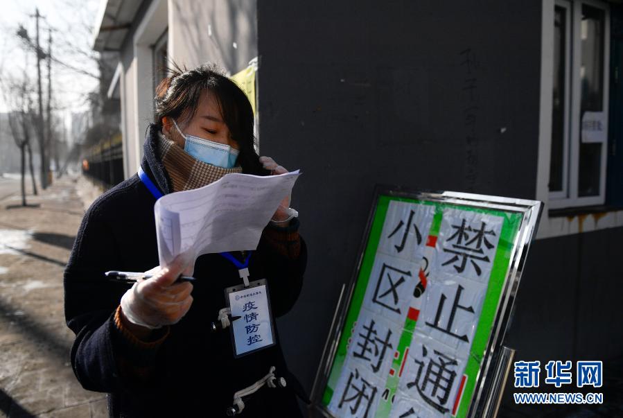 1月24日,在通化市东昌区老站街道新园社区育新小区,社区网格员核对居民的采购需求清单。