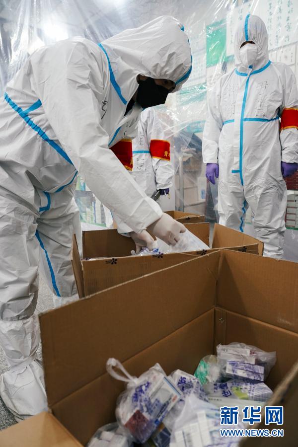 1月24日,在通化市东昌区一家药店,进行药品配送服务的志愿者清点订单药品。