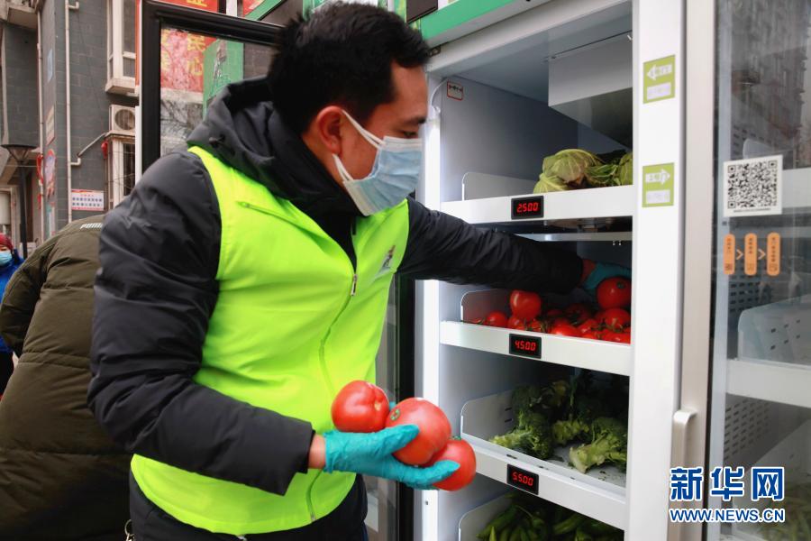 1月24日,智能生鲜自助柜配送人员在补货。新华社发