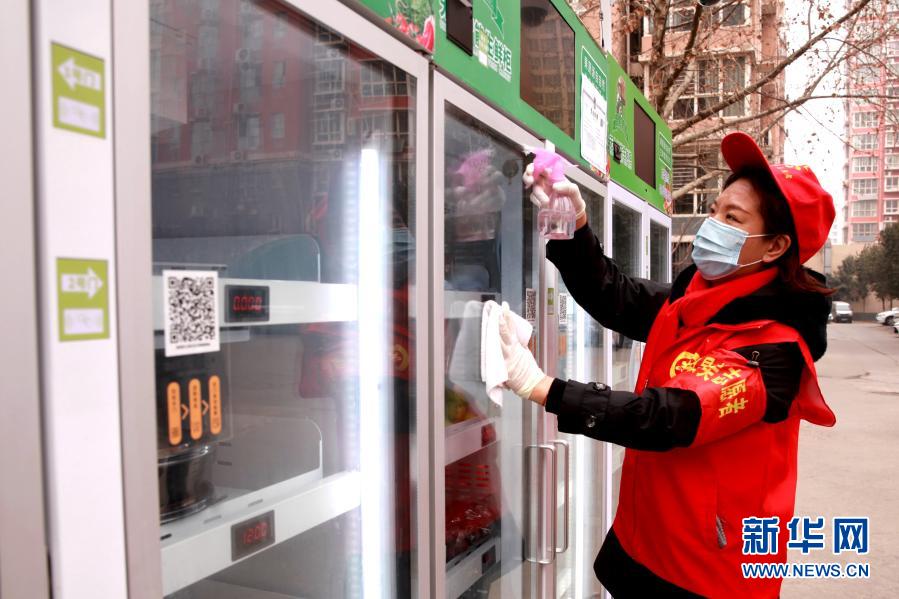 1月24日,志愿者对智能生鲜自助柜进行消毒。新华社发