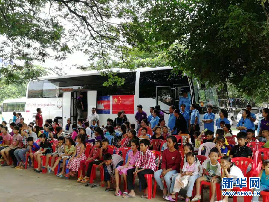 2018年7月,在柬埔寨马德望省,来自中柬两国的医务人员对当地学生进行先心病筛查。新华社发