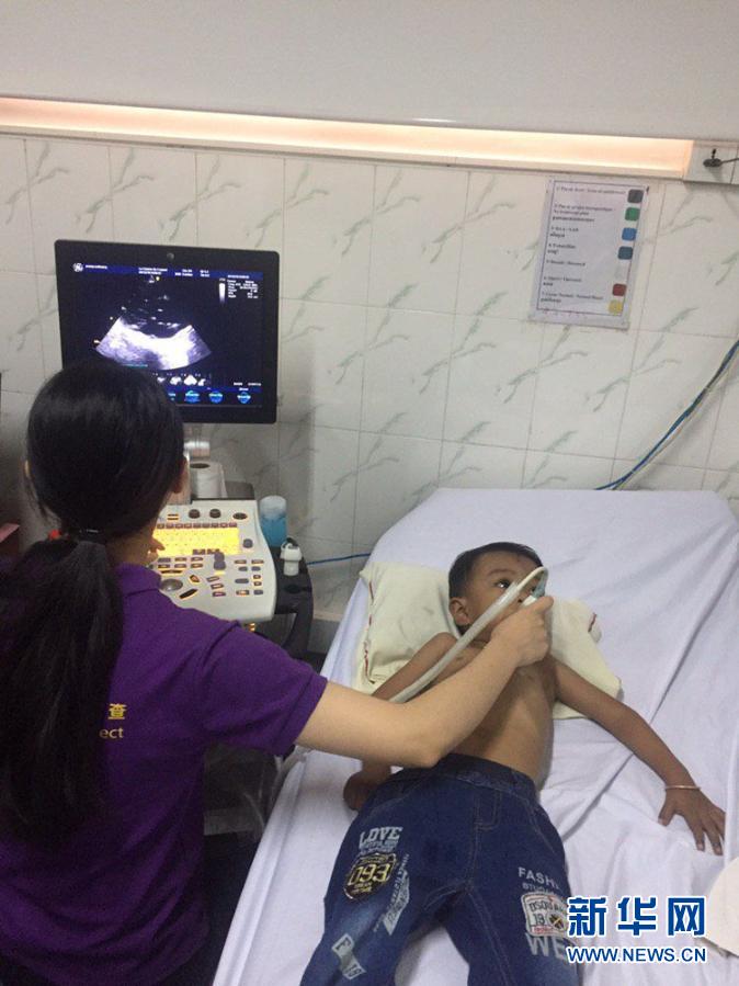 2019年,在柬埔寨金边,中国医生为柬埔寨儿童进行心脏检查。新华社发(谢莫尼勒摄)