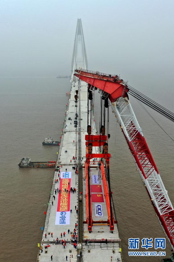 这是1月24日拍摄的舟岱大桥主线贯通施工现场(无人机照片)。新华社发(姚峰 摄)