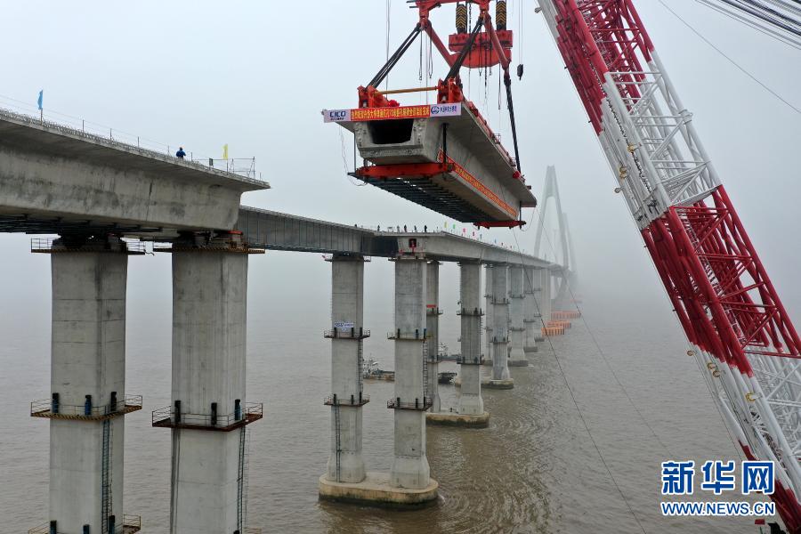 1月24日,大型浮吊船在放置最后一片预制箱梁(无人机照片)。新华社发(姚峰 摄)