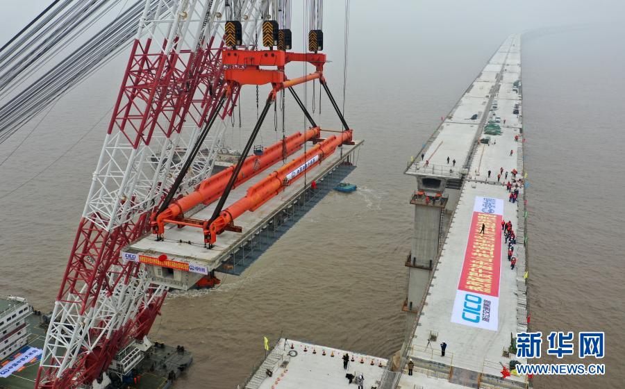 1月24日,大型浮吊船在放置最后一片预制箱梁(无人机照片)。新华社发(沈磊 摄)