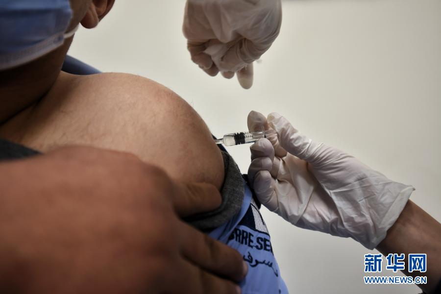 1月24日,在埃及伊斯梅利亚省阿布·哈利法急诊医院,一名医护人员接种中国新冠疫苗。