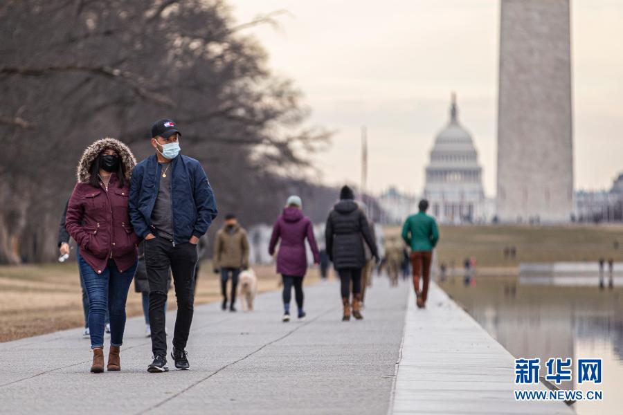 1月24日,在美国首都华盛顿,人们戴着口罩在林肯纪念堂倒影池附近游览。新华社发(亚伦 摄)