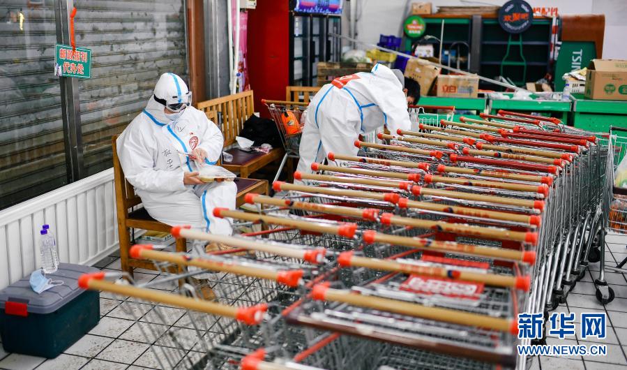 在吉林省通化市东昌区某超市内,杜思成(左)等待同伴选配商品的间隙吃晚饭(1月24日摄)。新华社记者 许畅 摄