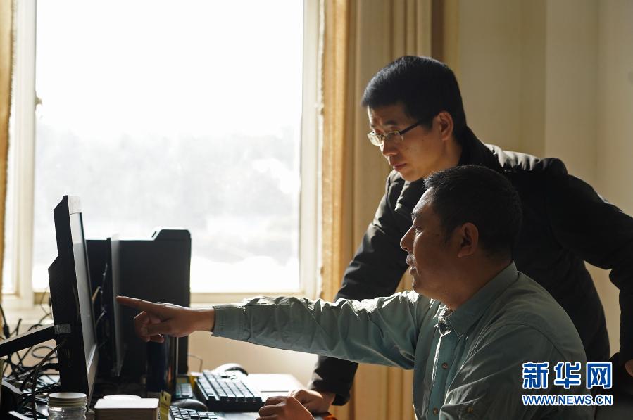 在江西省野生动植物救护繁育中心,汪志如(前)与况绍祥用跟踪系统查看白鹤“爱爱”失联时的信号定位(1月18日摄)。