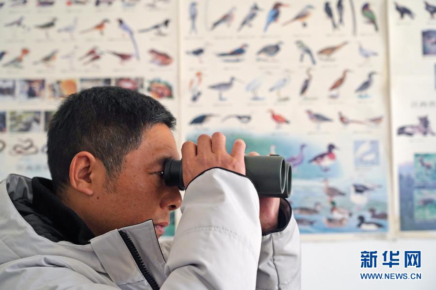 在江西省野生动植物救护繁育中心,汪志如调试望远镜准备出发寻找白鹤“爱爱”(1月18日摄)。