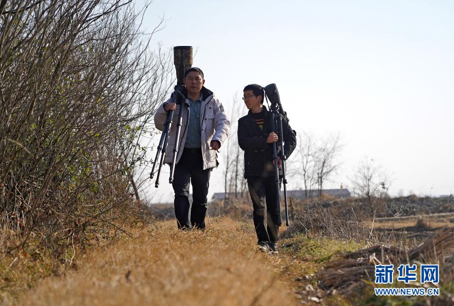 在江西省余干县康山垦殖场,汪志如(左)与况绍祥扛着观测设备准备准备观测和拍摄白鹤(1月18日摄)。