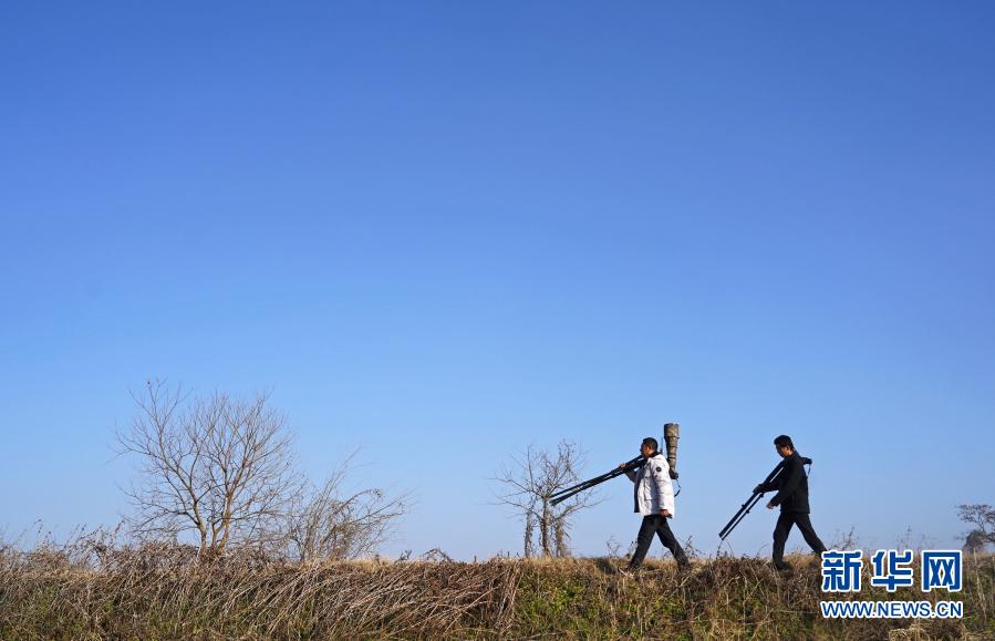 在江西省余干县康山垦殖场,汪志如(左)与况绍祥扛着观测设备准备观测和拍摄白鹤(1月18日摄)。