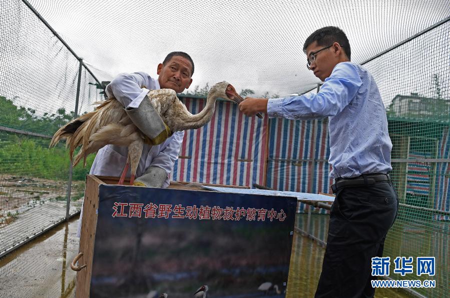 在江西省野生动植物救护繁育中心,况绍祥(右)协助工作人员将白鹤“爱爱”装入特制木箱,正式踏上千里“寻亲之旅”(2018年5月7日摄)。