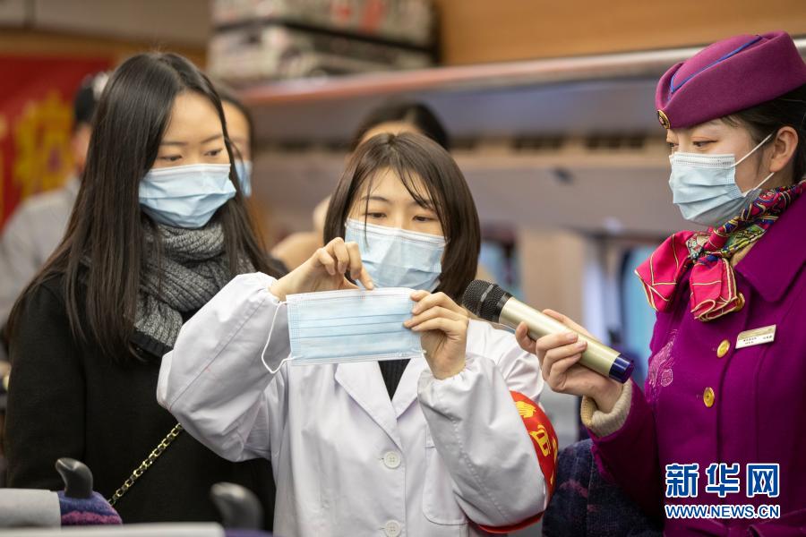 1月25日,成都铁路局重庆疾病预防控制所工作人员(中)在列车上向旅客讲解如何正确佩戴口罩。