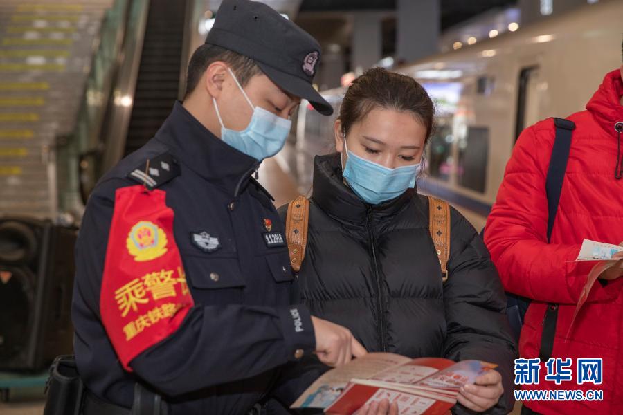 1月25日,重庆铁路公安处民警在重庆西站站台上给旅客发放防疫宣传单。