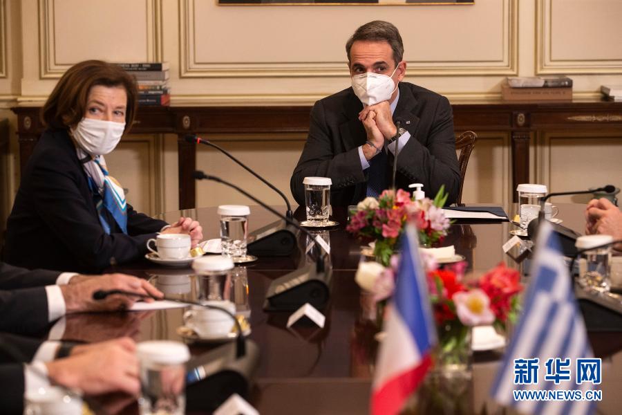 1月25日,希腊总理米佐塔基斯(右)在雅典会见到访的法国国防部长帕利。希腊国防部长帕纳约托普洛斯25日与到访的法国国防部长帕利签署一项军购协议,希腊将从法国购买18架“阵风”战机。新华社发(马里奥斯·罗洛斯摄)