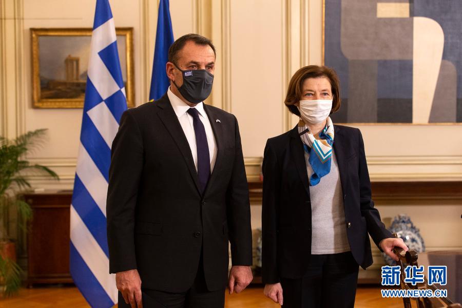 这是1月25日在希腊雅典拍摄的希腊国防部长帕纳约托普洛斯(左)和到访的法国国防部长帕利。新华社发(马里奥斯·罗洛斯摄)
