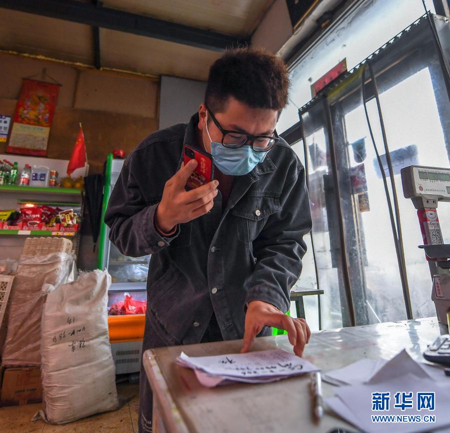 1月25日,王撼东在商店里与封闭小区内的居民核对买菜清单。