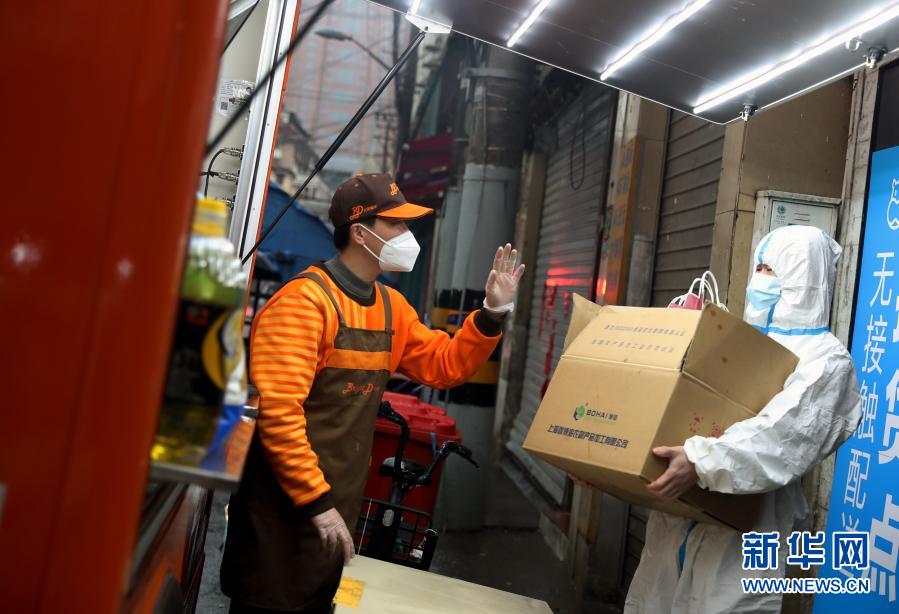 1月26日,在贵西小区的隔离线前,早餐车上的工作人员将30份免费早餐交给为居民服务的志愿者。
