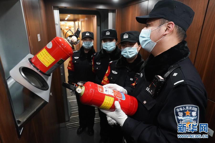 1月26日,南京铁路公安处乘警支队三大队乘警长石驰(右一)在车厢内向女乘警讲解灭火器使用方法。