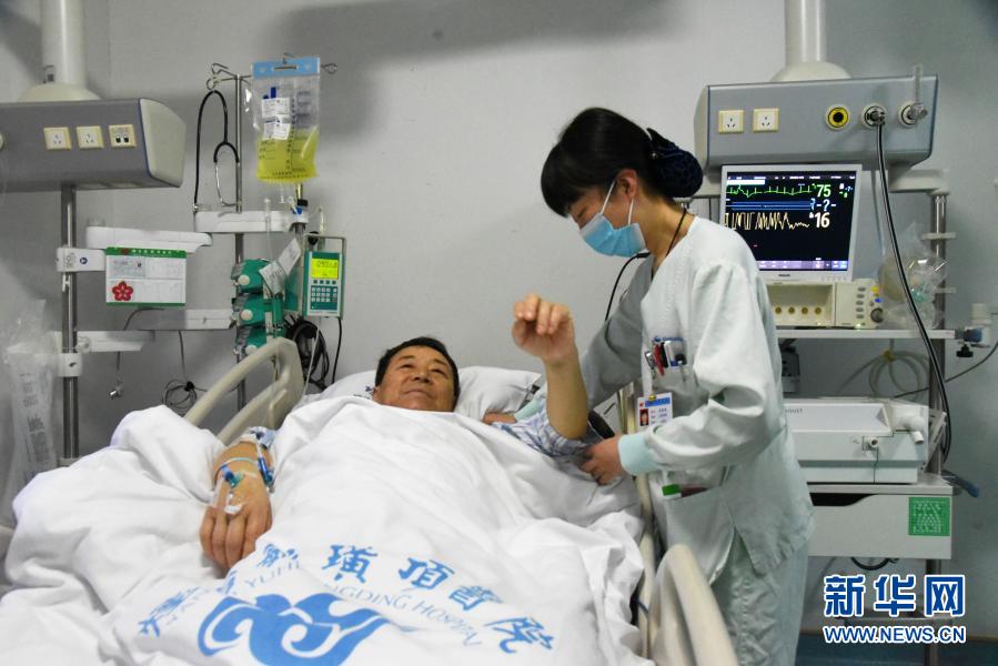 1月26日,医护人员查看山东笏山金矿事故幸存者张某的身体状况。