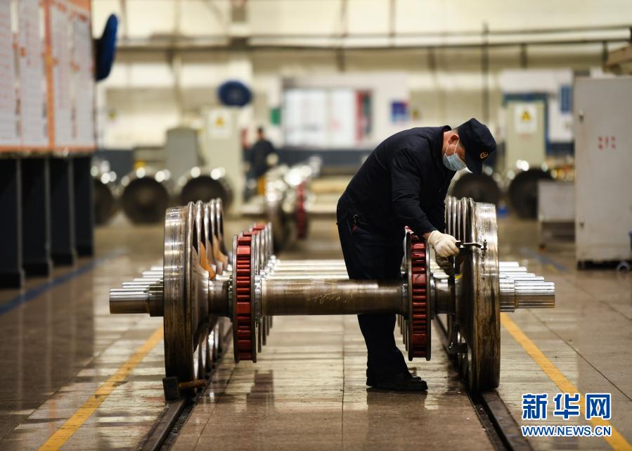1月26日,在中国铁路成都局集团有限公司成都北车辆段轮轴车间,工作人员在对生产的轮对进行复检。