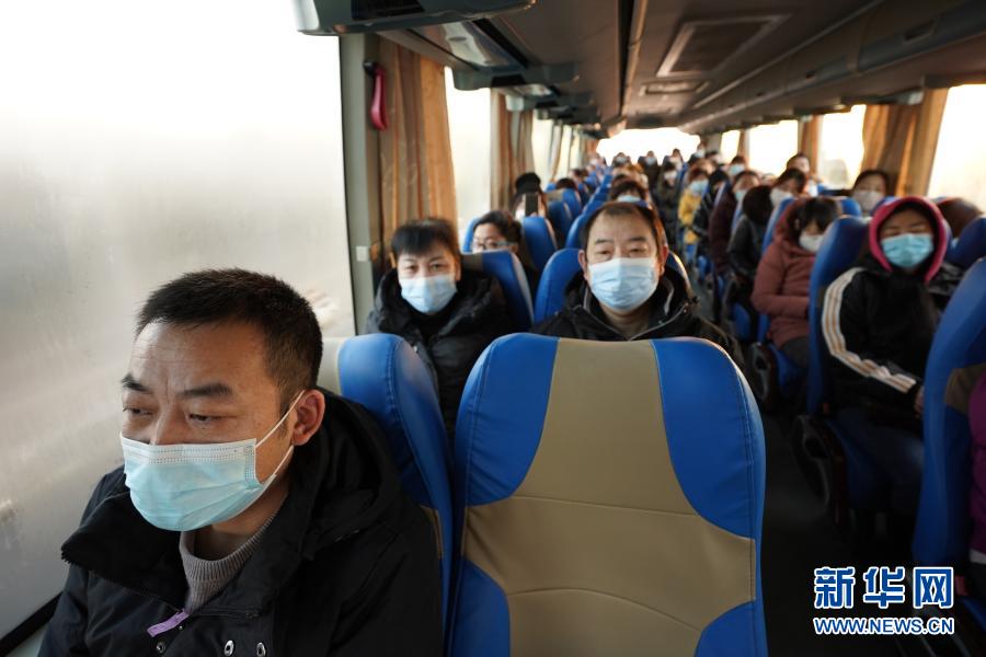1月26日,武师傅(左一)与同事们乘大巴前往位于北京市朝阳规划艺术馆的接种点,准备进行新冠疫苗第二剂接种。新华社记者 贾浩成 摄