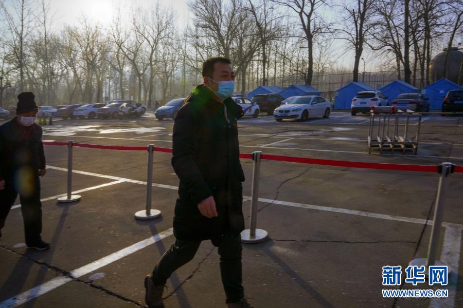 1月26日,武师傅(右)与同事们有序进入位于北京市朝阳规划艺术馆的接种点,接受新冠疫苗第二剂接种。新华社记者 刘金海 摄